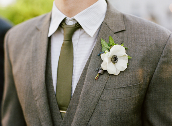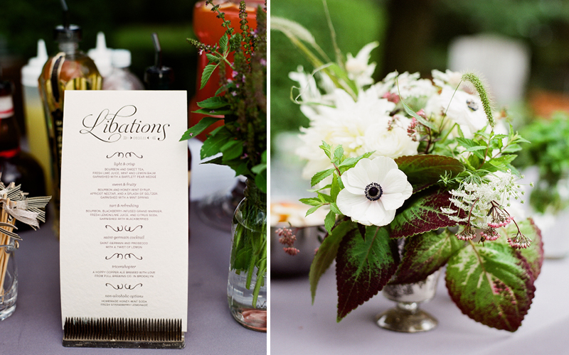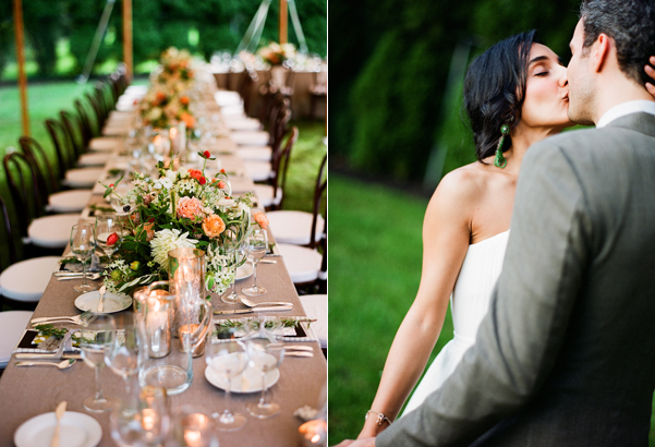 Vibrant tones of greens, white, black, and natural linen directed the ceremony and cocktail hour, with additions of peach and coral throughout the reception. Seasonal flowers and mercury glasses lined the single long table, and provided a warm and intimate ambiance for the plated dinner and dancing.