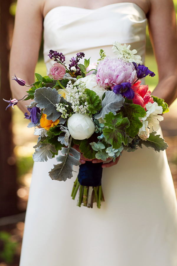 The day of saw a total explosion of color: peonies, garden roses, geranium, bay laurel, dusty miller, ranunculus, scabiosa, mint, hydrangea, clematis, spray roses, snowberry, and a touch of lilac. It looked wild, natural, but so very appropriate to the location.